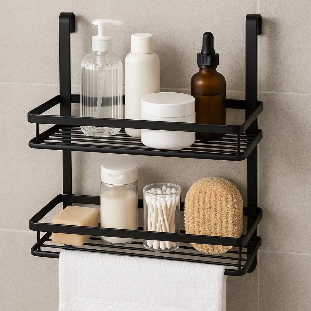 Innovative design fits over towel bars, adding extra storage without drilling. Ideal for holding toiletries, cosmetics, or rolled towels. Adjustable and lightweight.